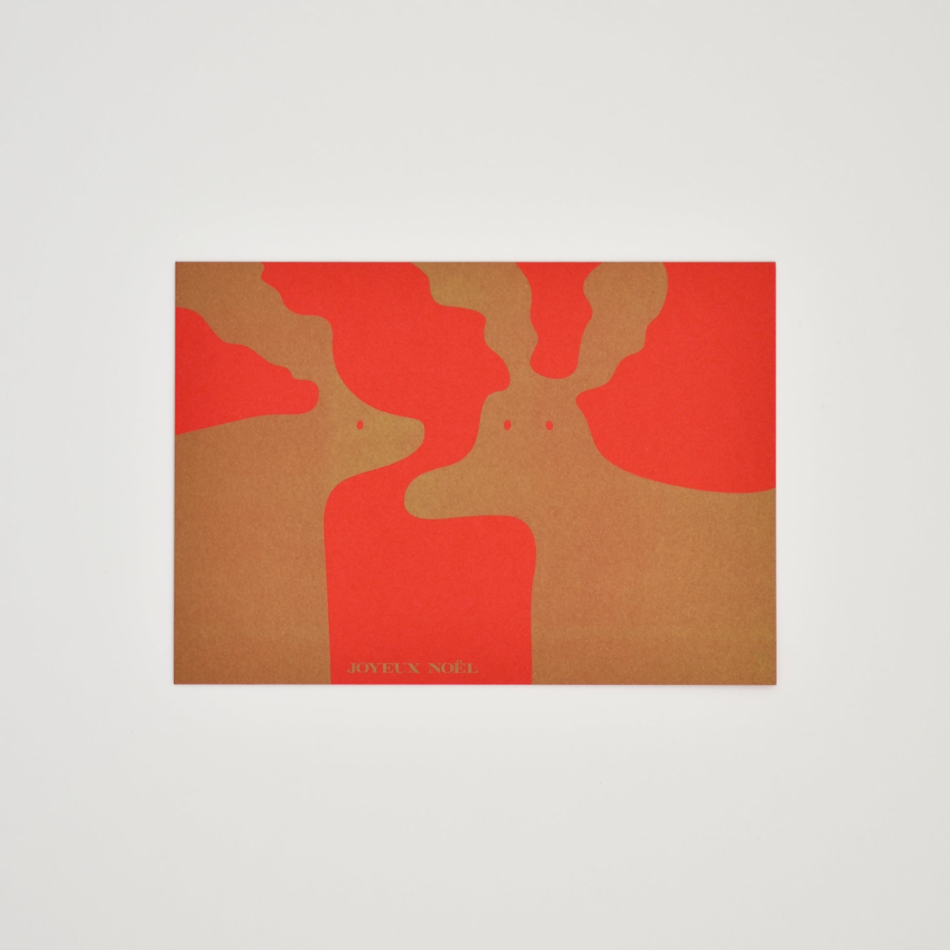 2人のサンタクロースがすれ違った瞬間でしょうか。見つめ合うトナカイを描いたカードセットです。クリスマスらしいあたたかい赤色の上からイエローゴールドで刷ったトナカイ達は、光の量によってころころと印象を変えます。封筒のメッセージはフランス語で、感謝の気持ちと新しい年を祝う言葉も添えられています。